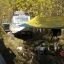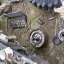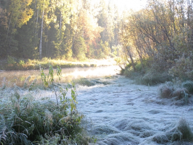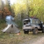 На ночлег остановились чуть выше разрушенного моста. Сопровождаемые, не хорошими предчувствиями долго обсуждали, что делать дальше. Решено едем, сколько едется, а дальше видно будет. Утро очень прохладное все вокруг покрыто пушистым инеем, старица и лужи замерзли, а промерзшая грязь без труда держит груженую машину. Лес вокруг «горит» всеми цветами радуги – благодать. А мы потихоньку направляемся домой. Как и предполагалось шпильки издохли километров через 20. Стоим, загораем любуемся природой. Приняли решение: снять с каждой ступицы по 1 шпильке. Провалившиеся шпильки пришлось спиливать болгаркой. Теперь надо еще 2 шпильки, взять не откуда. Здесь случилось невероятное, вдруг на дороге появился Андрей Паршаков за рулем УАЗ патриот(из Верхней Колвы) . Остановился и, о чудо, у него, совершенно случайно, оказались две шпильки именно для нашей ступицы. Спасибо ему огромное.
