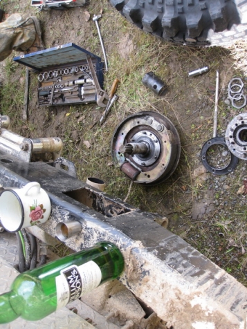скрытие показало – ха гриб, всего лишь гриб. Вот только сломался не обычно, лопнула не ось, а тарелка, и отломками полностью заклинило полуось. Вот это и ввело в заблуждение, ни разу до этого не заклинивало, у меня мост. Запасной гриб есть и даже не одини ремонт проходит уже в приподнятом настроении - разобрать, помыть, поменять всего лишь дело техники. И снова в путь. На исходе 3 его дня из 3 отпущенных контрольных дней, преодолев эпическую кучу поперечных канав, бродик через р. Колва (всего до бампера), прибываем в д. Талово. Время к полуночи, темно, а вот и знакомый Дефендер– Друзья здесь. Все выбежали из дома, услышав работу машины. Ждут давно. Закатили пир горой на половину ночи.