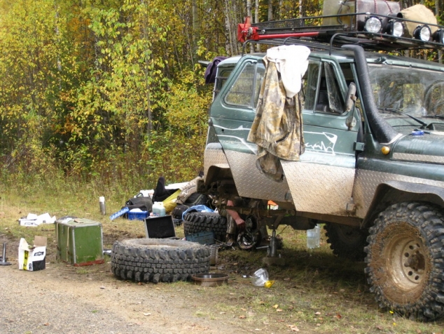 Однако мы рано обрадовались думая, что сегодня доберемся до деревни. Жуткий хруст и заклинивший задний мост испортил на корню все хорошее настроение. Машина вообще отказалась хоть как – то двигаться. Сняли задний кардан и кое как на переднем мосту оттащили машину с дороги.