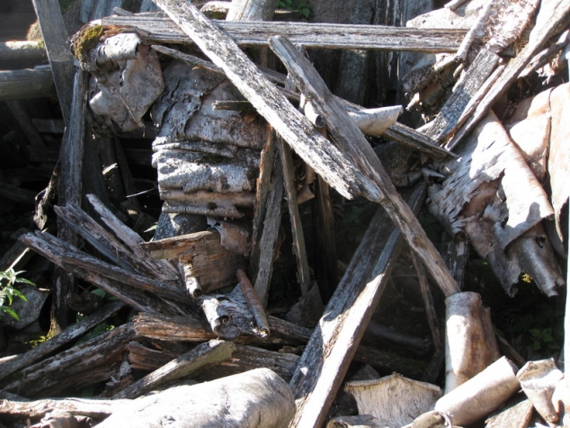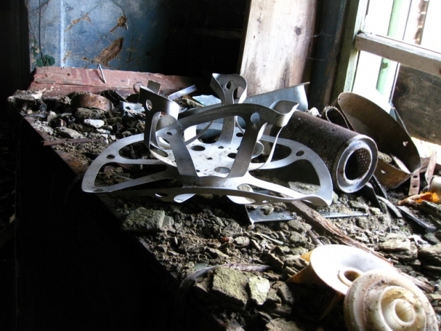 Гнетущая тишина даже птиц не слышно. Мрачность места еще более заметна на фоне ясного, теплого дня. И ощущение какого-то не приятного взгляда в спину не дает расслабиться. Повсюду свежие следы пребывания людей (скорлупа недавно почищенных яиц и др …)Чуть позже нашли свежие следы медведя – видимо хозяин тайги наблюдал за нами. Долго ходим, осматриваемся, наконец, нашли агрегатную, в подсобном помещении которой, среди множества наваленных болтов, гаек и прочего хлама была найдена искомая пружина для педали газа. Среди обветшалых зданий, возвышаясь над ними, стоит покосившаяся водонапорная башня, держится на честном слове, но продолжает противостоять стихиям и времени. Подняться на верх не представляется возможным поли лестницы давно прогнили и обвалились. Внутри слышны скрипы, так вздыхают старики, да сама башня напоминает сгорбленного старого деда – ворчливого и неразговорчивого. На этом решаем закончить осмотр «достопримечательностей» ведь время близится, к вечеру надо найти стоянку и разбить лагерь. Немного поплутали по окрестностям, заехали в карьер, с отвалов, которого еще раз полюбовались Тулымским камнем (где-то там истоки красавицы Вишеры) и спустились к реке Няризь на нашу старую стоянку. С удовольствием отметили, что люди здесь бывают, аккуратно лежат заготовленные дрова, сложен очаг. Помню, как в первую мою экспедицию под дождем искали место для лагеря и среди непролазного леса вперемешку с топями нашли крошечную полянку прямо на берегу речки на месте давно заросшей дороги, как расчистили ее и притащили с зоны несколько стульев. А уезжая, оставили не большую поленницу дров. Приятно, когда кто-то пользуется этим, не пакостит, и заботится о следующих путешественниках, остановившихся на стоянке. Ведь может случиться так – человек добрался до места поздно ночью - промок, устал, замерз (или болен), а здесь уже все есть – только развести огонь. А уж он согреет и накормит и даст отдохнуть.