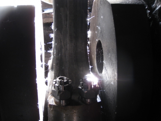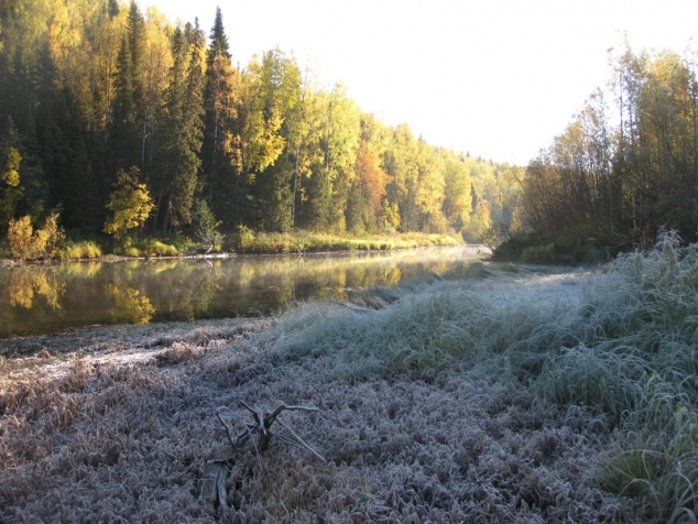 На ночлег остановились чуть выше разрушенного моста. Сопровождаемые, не хорошими предчувствиями долго обсуждали, что делать дальше. Решено едем, сколько едется, а дальше видно будет. Утро очень прохладное все вокруг покрыто пушистым инеем, старица и лужи замерзли, а промерзшая грязь без труда держит груженую машину. Лес вокруг «горит» всеми цветами радуги – благодать. А мы потихоньку направляемся домой. Как и предполагалось шпильки издохли километров через 20. Стоим, загораем любуемся природой. Приняли решение: снять с каждой ступицы по 1 шпильке. Провалившиеся шпильки пришлось спиливать болгаркой. Теперь надо еще 2 шпильки, взять не откуда. Здесь случилось невероятное, вдруг на дороге появился Андрей Паршаков за рулем УАЗ патриот(из Верхней Колвы) . Остановился и, о чудо, у него, совершенно случайно, оказались две шпильки именно для нашей ступицы. Спасибо ему огромное.