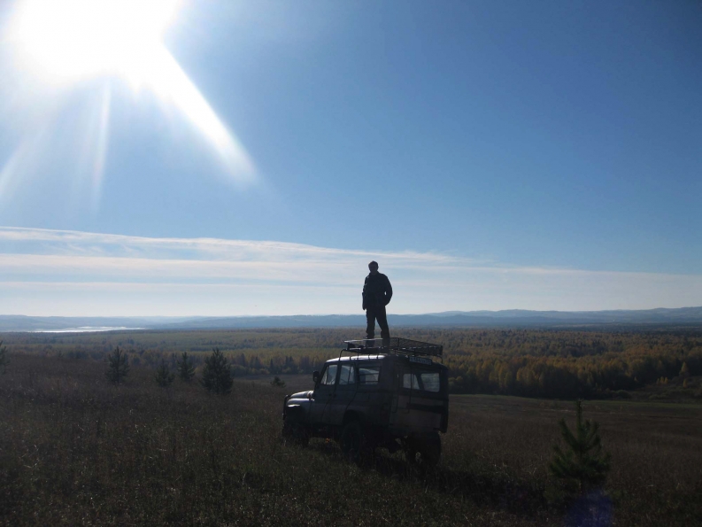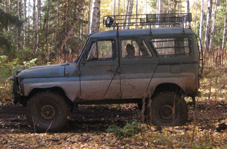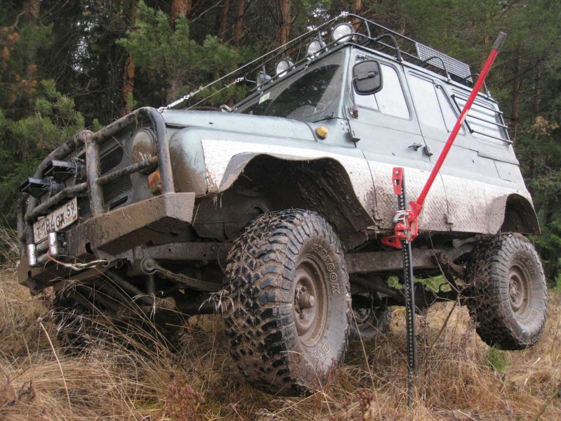 Штатного освещения на УАЗе не достаточно для тяжелого бездорожья. Поэтому установили дополнительно шесть танковых фар. Две на бампере и четыре на багажнике, причем крайние под углом в 20 градусов относительно основной оси автомобиля.